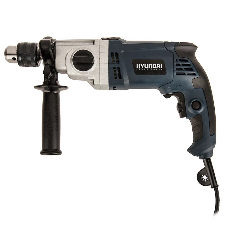 دریل چکشی فوق توانی برابر 850 وات دارد و از گیربکسی دو وضعیتی برخوردار است. با کمک این دریل میتوانید دستگاه را در دو حالت چکشی و سوراخکاری قرار دهید. این دستگاه از قابلیت کنترل سرعت برخوردار است و کاربر میتواند سرعت آن را در یکی از حالتهای 1000-0 و 2800-0 دور بر دقیقه قرار دهد. حداکثر قطر سوراخکاری این دریل چکشی در چوب، فلز و مصالح به ترتیب برابر 25، 13 و 16 میلیمتر است. سهنظام به کار رفته در ساخت این محصول از نوع آچارخور 13 میلیمتری است. این دستگاه دارای قفل سوییچ بوده و کاربر با کمک آن میتواند بدون نگه داشتن شستی دستگاه به سوراخکاری بپردازد. چرخ دندههای این دستگاه تماما فلزی است. این دستگاه از قابلیت چرخش به سمت راست و چپ برخوردار بوده که در خارج کردن متههای گیر کرده در سطوح کمک زیادی میکند. شرکت «هیوندای» برای افزایش تسلط کاربر روی این دستگاه، دستهای کمکی به همراه آن عرضه میکند که از قابلیت چرخش 360 درجه برخوردار است.